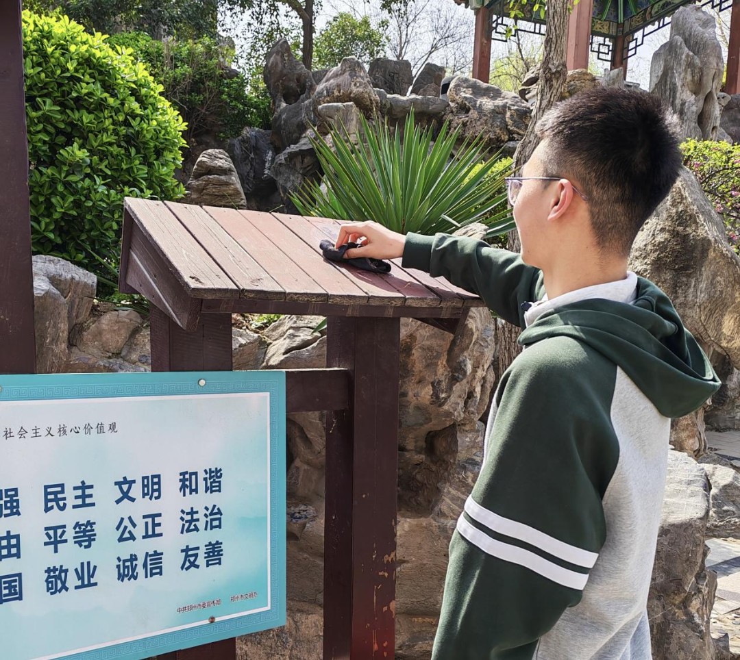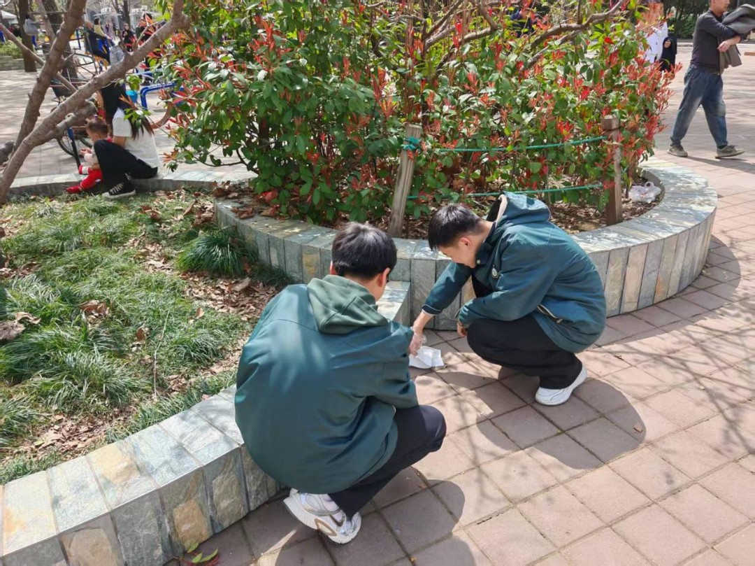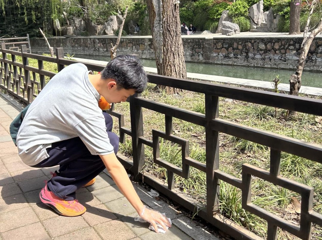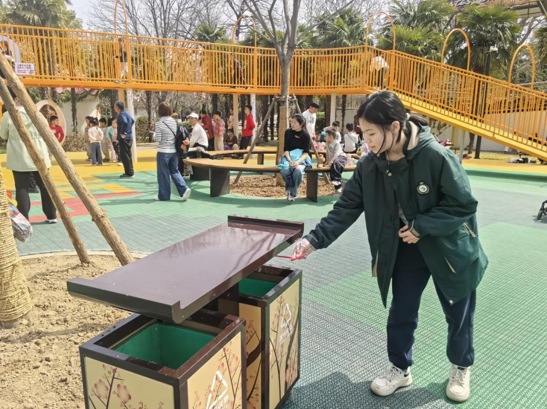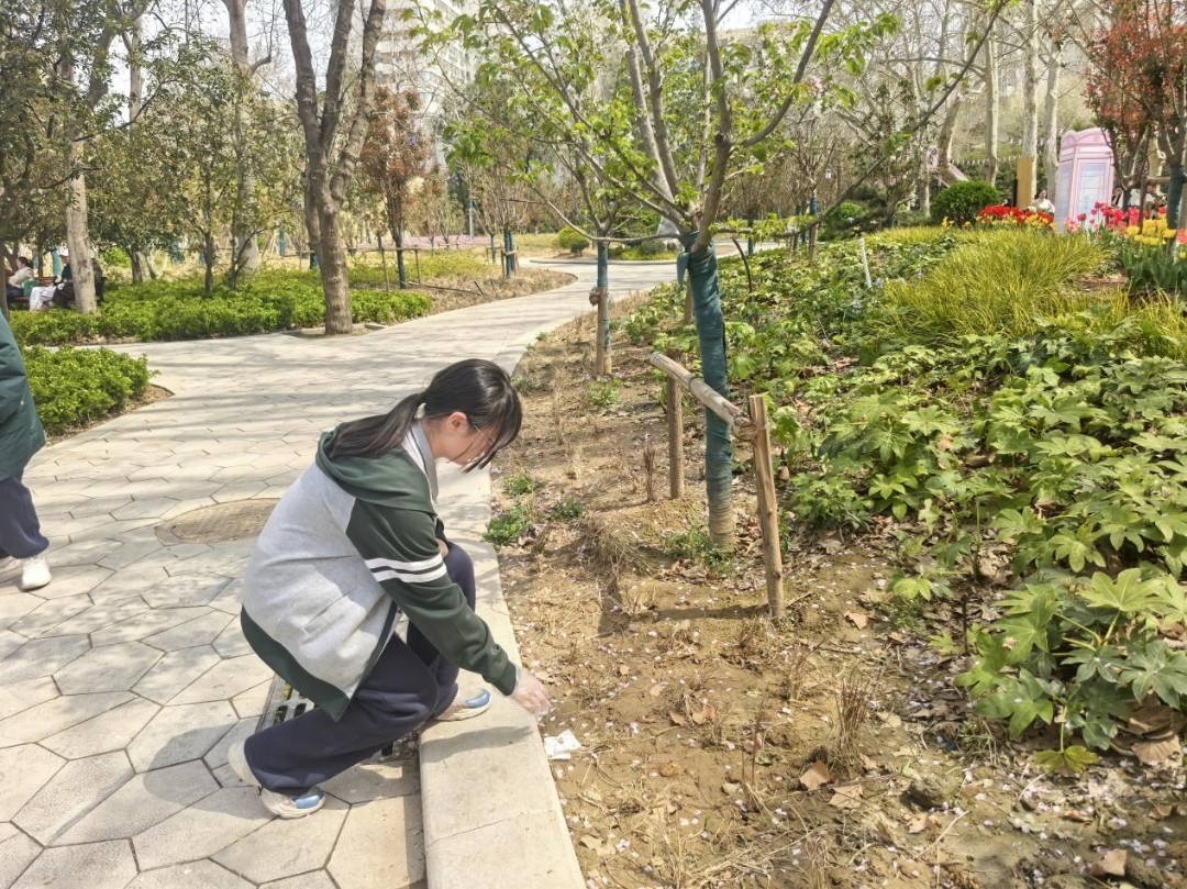 春日的郑州市人民公园,阳光和煦,游人如织。身着校服的八年级学生们,手持垃圾袋、抹布等工具,精神饱满地投入到志愿服务中。他们分工明确,配合默契,有的仔细清理着草坪、花坛和道路上的烟头、纸屑、塑料袋等废弃物;有的则认真擦拭公园内的公共座椅、公告栏等设施。同学们不怕脏、不怕累,用实际行动践行着“奉献、友爱、互助、进步”的志愿精神。