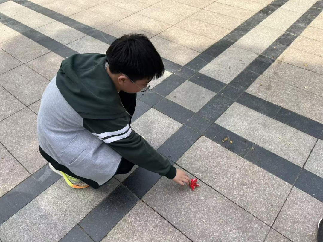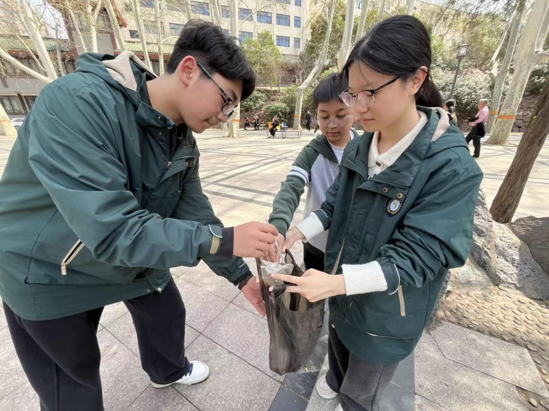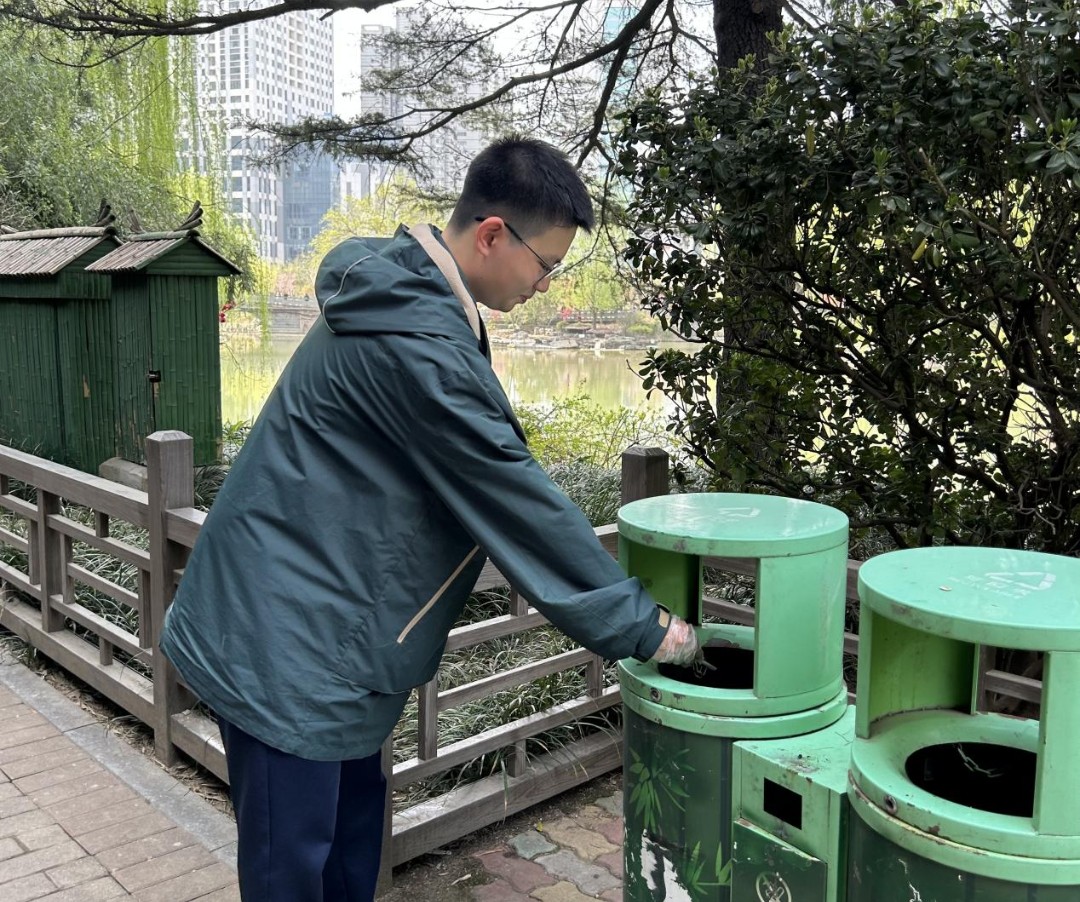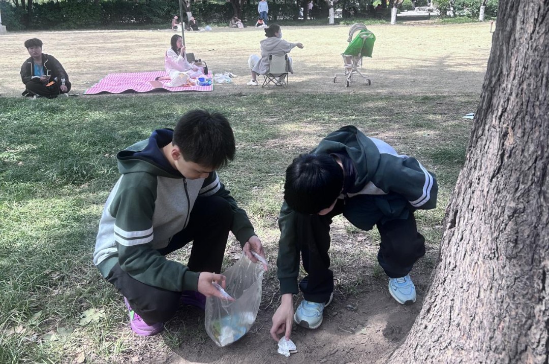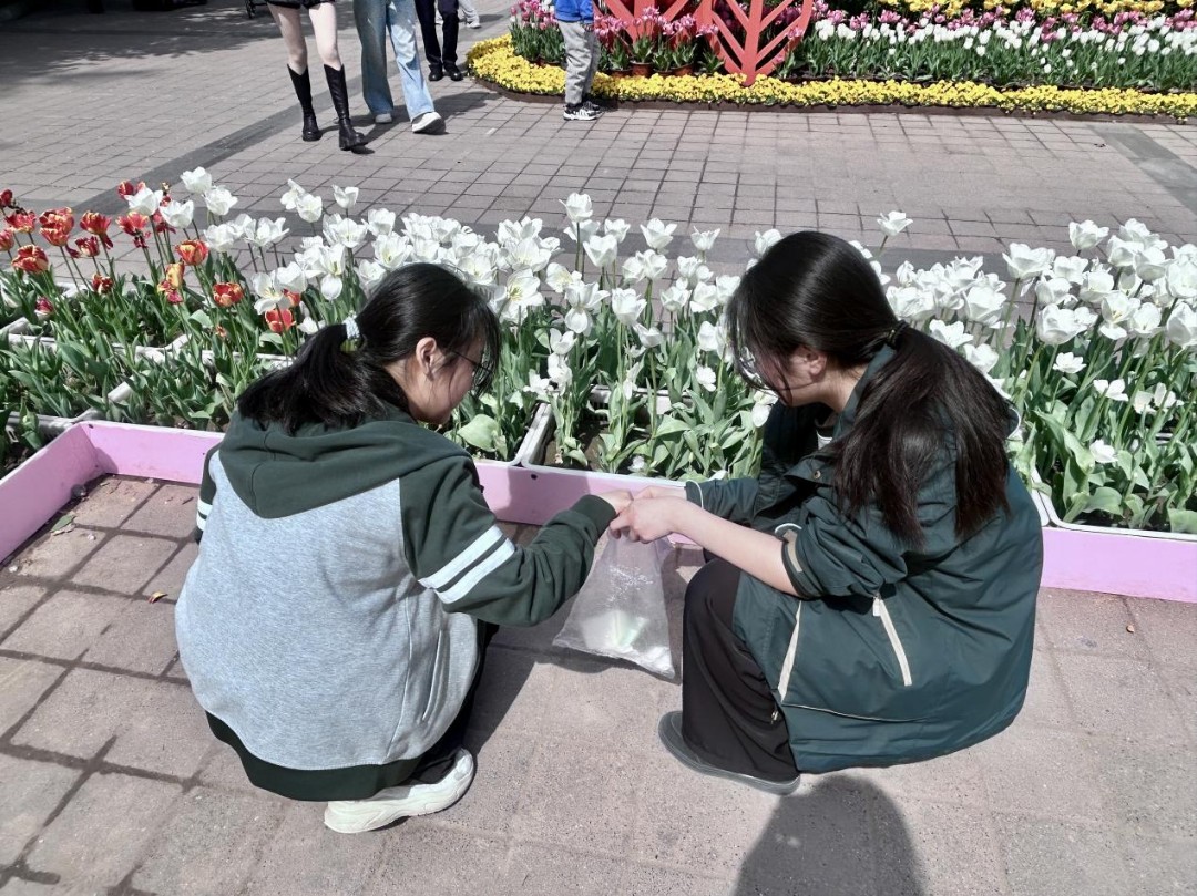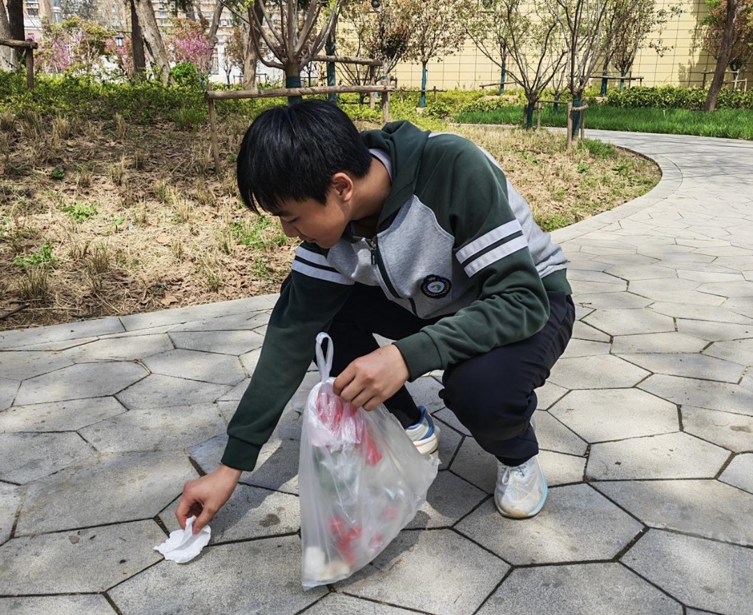 春日的郑州市人民公园,阳光和煦,游人如织。身着校服的八年级学生们,手持垃圾袋、抹布等工具,精神饱满地投入到志愿服务中。他们分工明确,配合默契,有的仔细清理着草坪、花坛和道路上的烟头、纸屑、塑料袋等废弃物;有的则认真擦拭公园内的公共座椅、公告栏等设施。同学们不怕脏、不怕累,用实际行动践行着“奉献、友爱、互助、进步”的志愿精神。