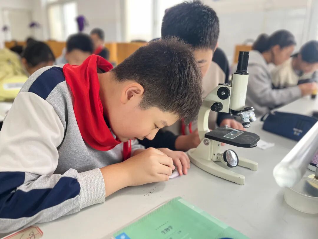 为了落实“双减”政策,增加同学们对科学研究的兴趣,提高实验探究能力,在10月份的生物课堂上,一场别开生面的生物实践活动在郑州市第七初级中学东校区七年级的生物实验室中精彩展开,为学生们开启了一扇通往微观世界的神奇大门。
