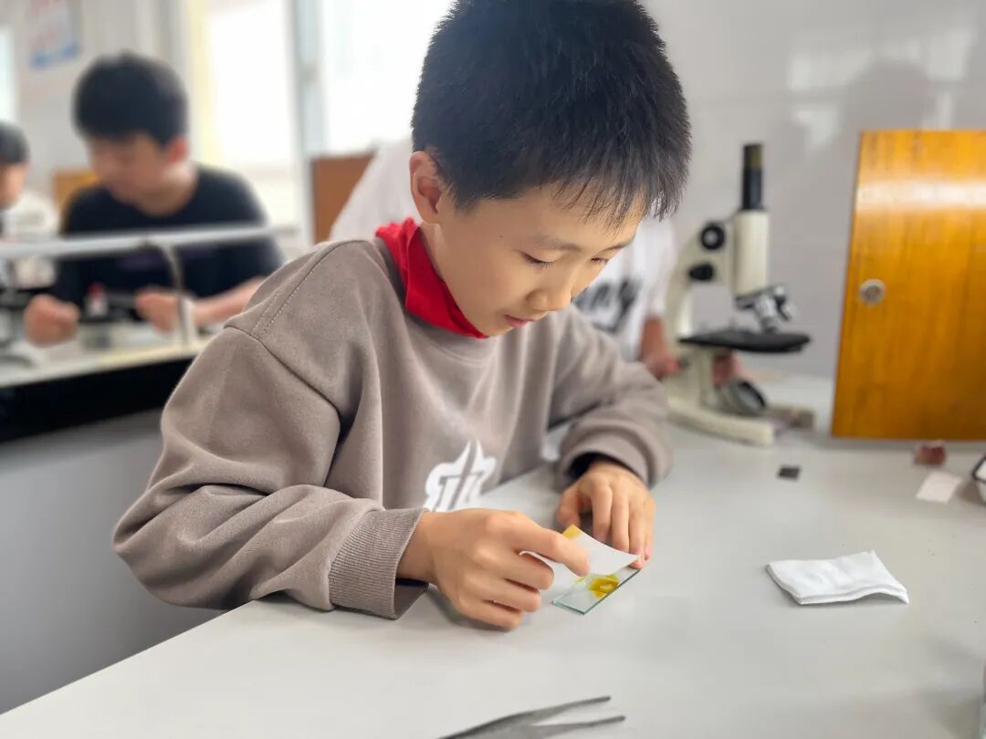 同学们在生物老师的悉心指导下,踏上了一段充满趣味与挑战的科学探索之旅。大家全神贯注,亲自动手制作玻片标本。他们谨慎地选取实验材料,精心地进行切片、染色等一系列操作,每一个步骤都饱含着他们对未知世界的好奇与热忱。